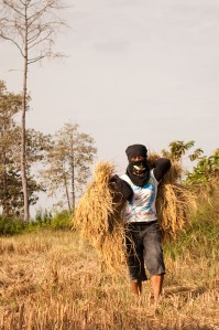 First things first: rice fields as far as they eye can see.  This is harvest time in much of the Isaan region so most families were involved in some way or another with bringing in the rice crop, almost all of which is done by hand.  Taking in the vast countryside and participating in the process of cutting, bundling, thrashing, drying and bagging rice brought home that well-known reality of the importance of rice to the country and its economic importance to nearly every family in the region.