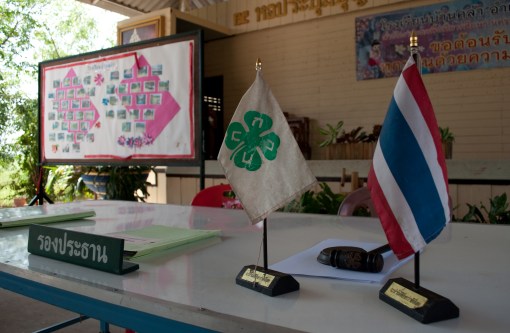 I also managed to connect with a few extremely helpful Peace Corps volunteers in the region.  One volunteer in a neighboring province informed me of a nearby village that has recently undergone major community development and transformation initiatives, all led by a dynamic local Thai woman committed to environmental responsibility and youth development.  Exciting stuff, and it got me thinking that I need to find some mentorship-type resources for some of the women looking to start similar initiatives in their communities.  Another couple introduced me to a phenomenal school in a neighboring province that has fully integrated agricultural education into their curriculum.  The success rate of this school in retaining kids, providing agricultural economic opportunities for youth as well as character/values/responsibility education and affecting broader change in their communities was phenomenal.  For any of you 4-Hers out there though, you’ll recognize the picture below taken at the school… I found 4-H in Thailand! Looking forward to learning more about the model they’ve put together and figure out what it might take to replicate it in some of the villages in which we’re working.